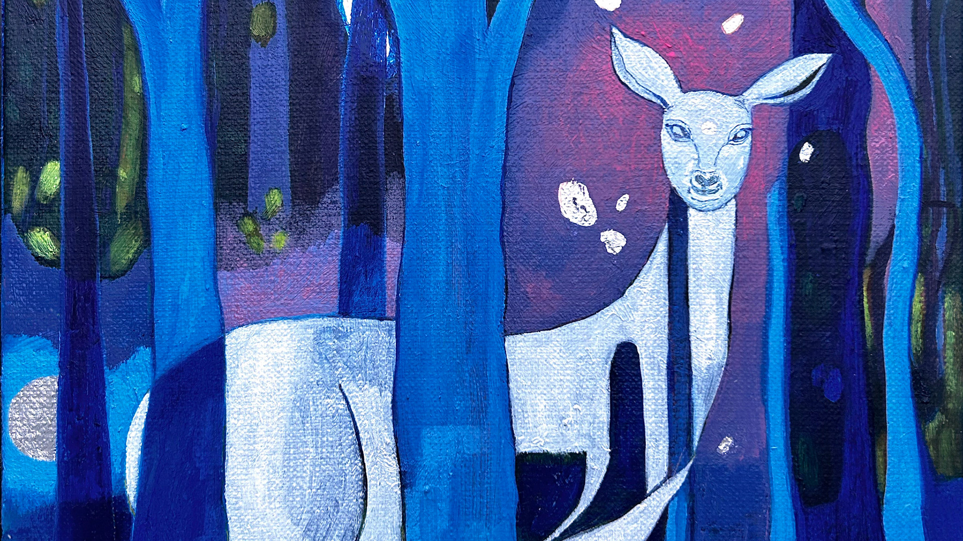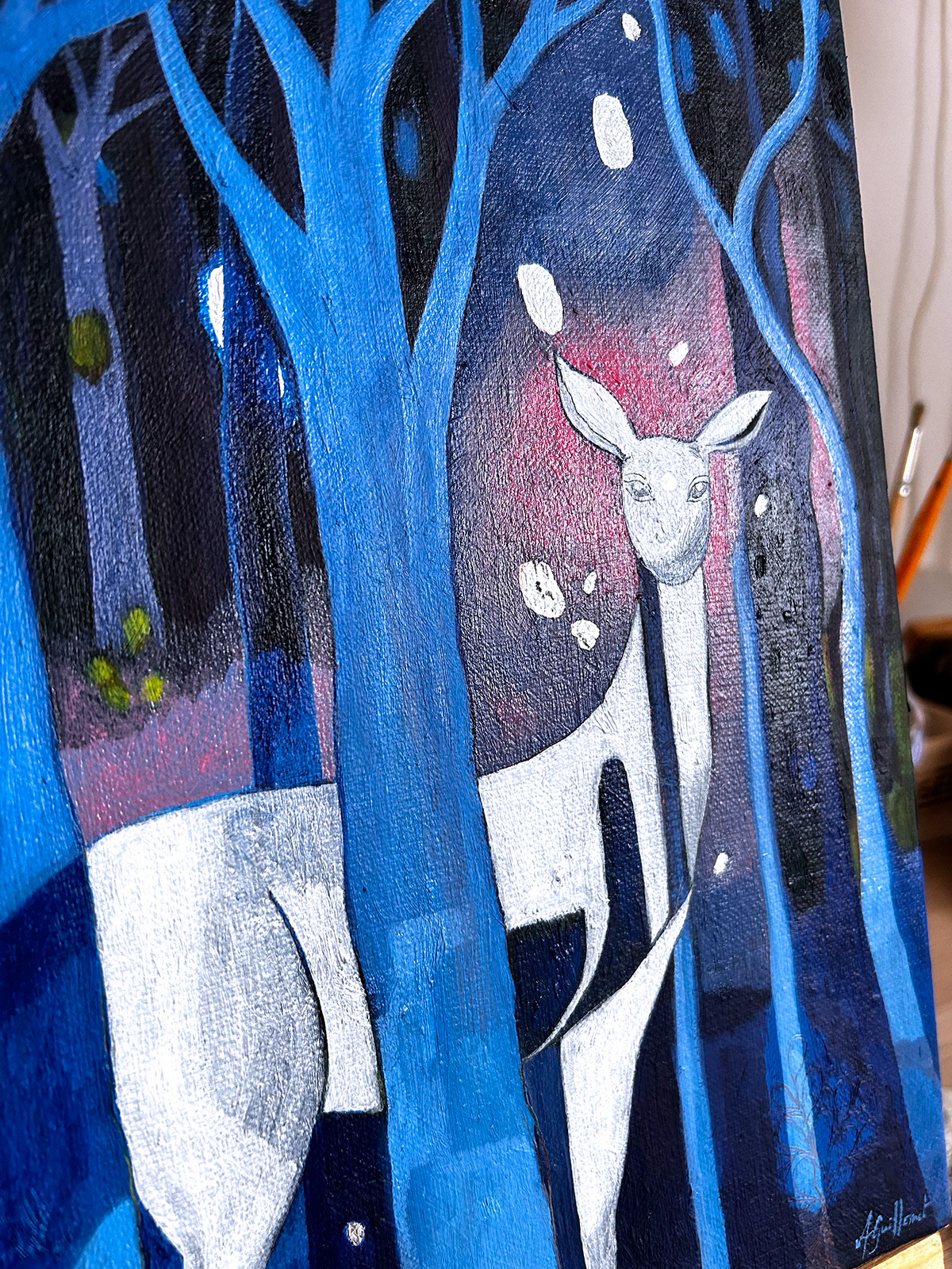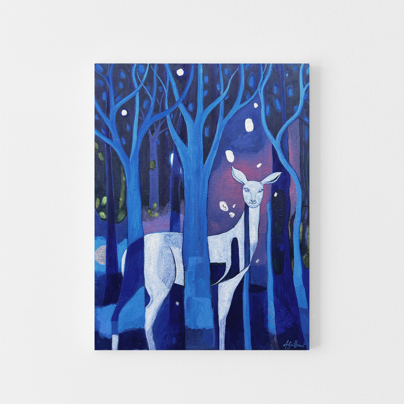 La biche blanche est une fée. On retrouve cet animal dans la littérature du moyen âge. La légende dit que suite à une malédiction, la nuit venue, certaines femmes se métamorphosent en biche blanche. Elle dit aussi que pour rompre ce charme, le chasseur donne un baiser à cette biche… Informations sur le tableau : 🎨 Huile et feuille d’argent sur toile • 35 x 27 cm・Disponible sur demande